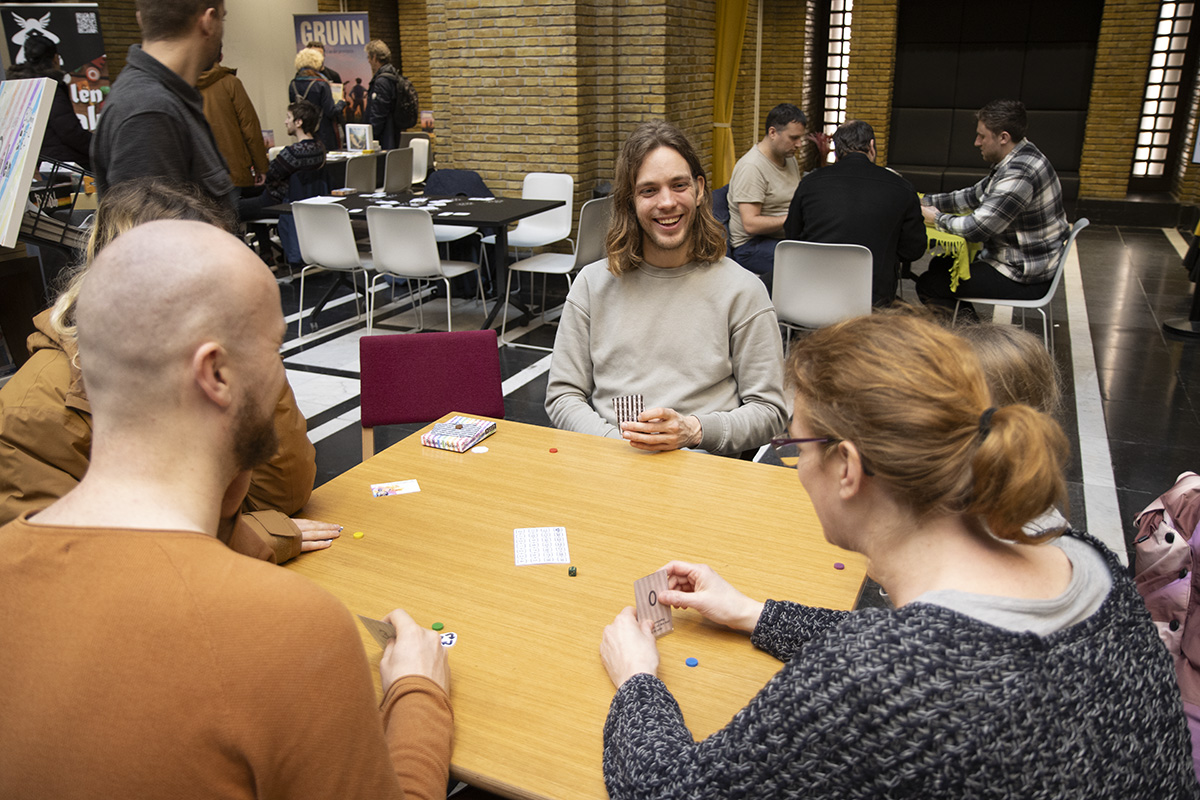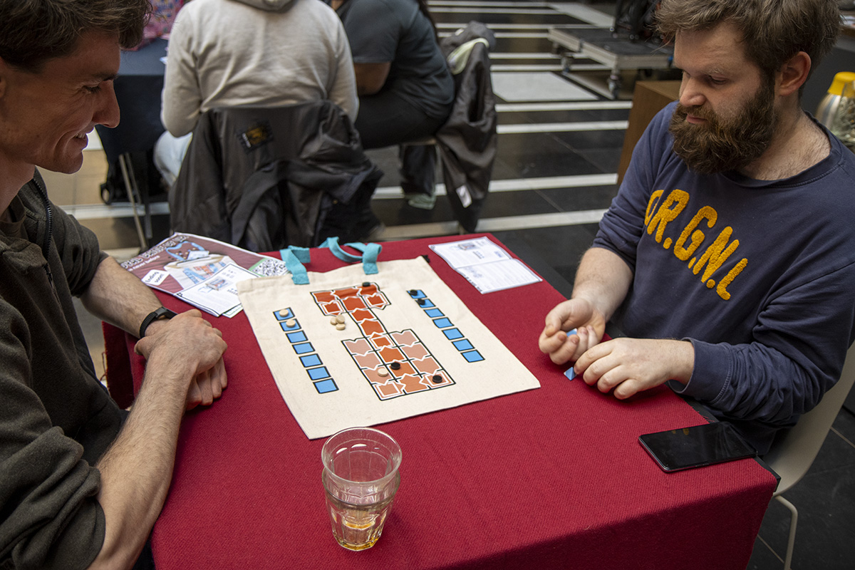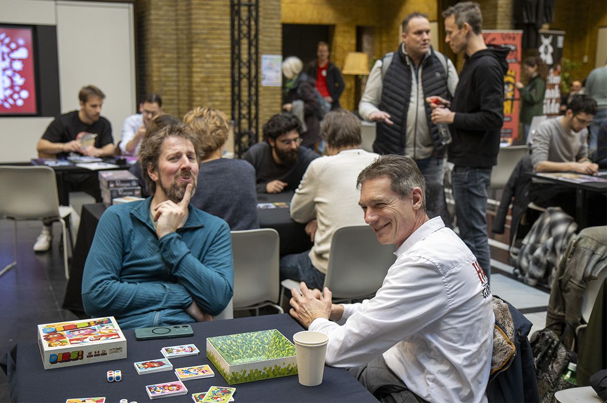 Ik heb me een paar uur vermaakt, leuke gesprekken gevoerd en spellen gespeeld. Ik heb met name genoten van het kaartspel Huilen = Ruilen. In dit spel krijgt iedere speler één geheime kaart met een verschillende waarde (bijv. -1, 0 en een handvol positieve getallen). Vervolgens moet je in twee ruilrondes telkens één verschillende medespeler verlokken tot een ruil. Die mag normaliter weigeren of accepteren, tenzij zijn kaart tot een bepaald antwoord dwingt. Aan het einde van de tweede ronde mag de bezitter van de 0 een medespeler dwingen tot een ruil. Het is de bedoeling om de twee ruilrondes met een hoge kaart te eindigen, die levert namelijk winstpunten op.
