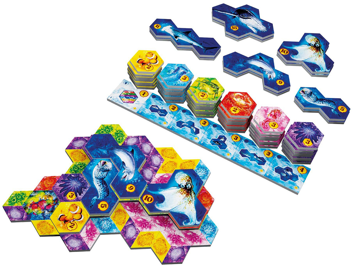 In mijn terugblik op de geslaagde beurs Zuiderspel 2024 had ik er al aandacht aan besteed. Inmiddels ligt de Nederlandstalige editie van het legspel Aqua al een paar dagen in de winkels. Dus is het, ondanks de gebruikelijke onnozele stilte van de distributeur Asmodee NL, de hoogste tijd er een nieuwsberichtje aan te wijden. Aqua is een ontwerp van Dan en Tristan Halstad, dat wordt uitgegeven door de Deense uitgever Sidekick Games. Bij dit spel vorm je via het draften van zeszijdige koraaltegels een bontgekleurd rif. Elke tegel bevat drie gekleurde koraalelementen. Je moet de tegels zo aanleggen, dat minstens één zijde wordt verbonden met dezelfde kleur. Wanneer je drie koraalelementen van dezelfde kleur verbindt, creëer je een leefgebied en mag je een zeszijdige kleine diertegel van de desbetreffende soort op dit leefgebied leggen. Bepaalde configuraties van diertegels geven je het recht er een (2-4 velden) grote diertegel op te leggen. Deze grote tegels scoren aan het einde allereerst de afgebeelde punten. Daarna worden ze verwijderd en doen ze dienst als opdrachtkaartjes, met extra punten voor de bijbehorende diertegelsoorten. Jouw kleine diertegels leveren zelf ook punten op, met een leuke bonus wanneer jij rond jouw diertegels koraalriffen (ketens van dezelfde kleur met een grootte van 4+) zichtbaar hebt liggen.